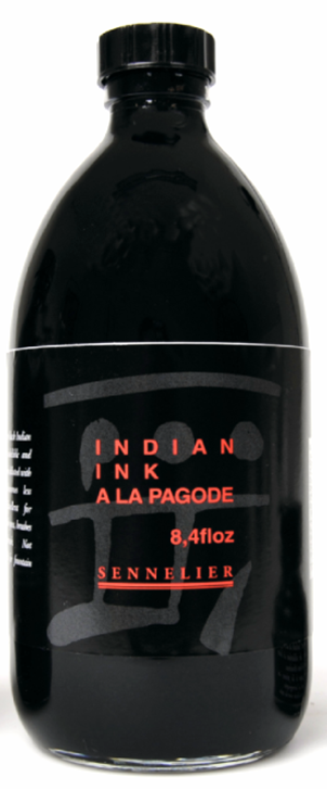 Sennelier Indian Ink is a beautiful deep black ink that is indelible and lightfast. When diluted with water it becomes less indelible. Excellent for calligraphy nib pens, brushes and airbrush.