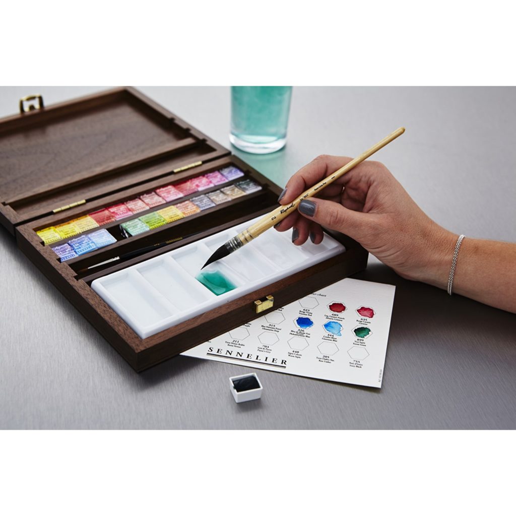 Sennelier watercolour set Walnut box 24 half pans