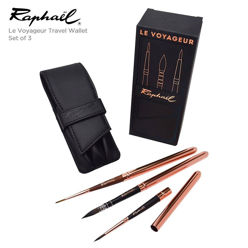 Travel Brush Wallet, Set of 3 — This elegant black imitation leather wallet with the Raphaël name embossed on the front holds three travel brushes — a Soft Aqua Round (Size 6), a Soft Aqua Quill (Size 3/0), and a Precision Round (Size 0). Metal caps protect the brush heads during travel, and extend the handles during painting sessions. The wallet includes a clip on the back for attaching to a pad, notebook, belt, or tote.