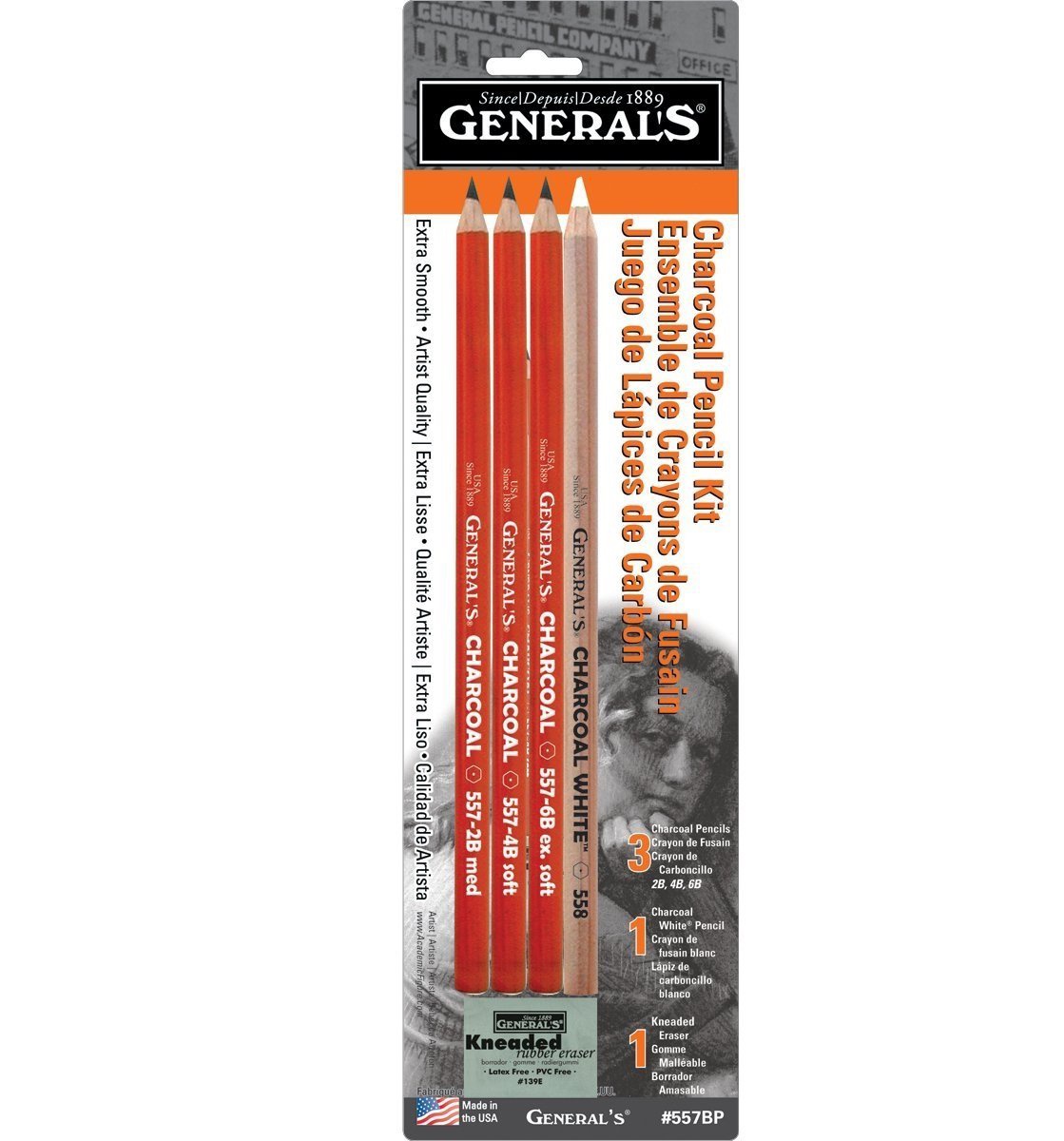 GENERAL PENCIL-Charcoal Pencil Kit. These extra smooth charcoal pencils are perfect for fine art drawing, sketching, and designing. This package contains three black charcoal pencils (2B, 4B, 6B), one white charcoal pencil, and one latex free, PVC free kneaded rubber eraser.