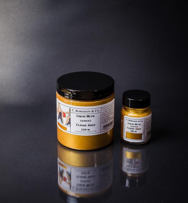 Roberson Liquid Metals have a rich deep colour, ideal for a wide range of applications including plaster, wood, paper & canvas. The Liquid Metal range does not tarnish and does not need to be varnished. All colours are intermixable and water wash up.