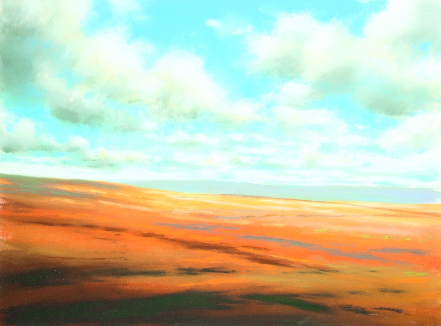 A big, dramatic sky forms the backdrop to a richly-coloured moorland. The white of the paper is used to form the clouds from negative shapes, which are given depth and volume by the use of greys to create shadow.