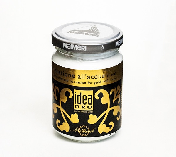 The Water-based operation is the glue enabling the leaf to stick to the surface. Fluid and ready to use. It is applied with a soft brush, taking care to cover the surface uniformly. After applying, wait at least 15 to 30 minutes so its adhesive power develops and then apply the leaf.